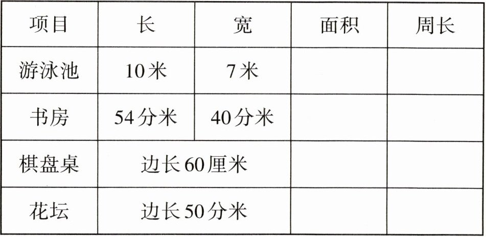 三、李叔叔家几件物品和建筑的数据统计如下,请你帮忙算出它们的面积和周长,并填在表中。