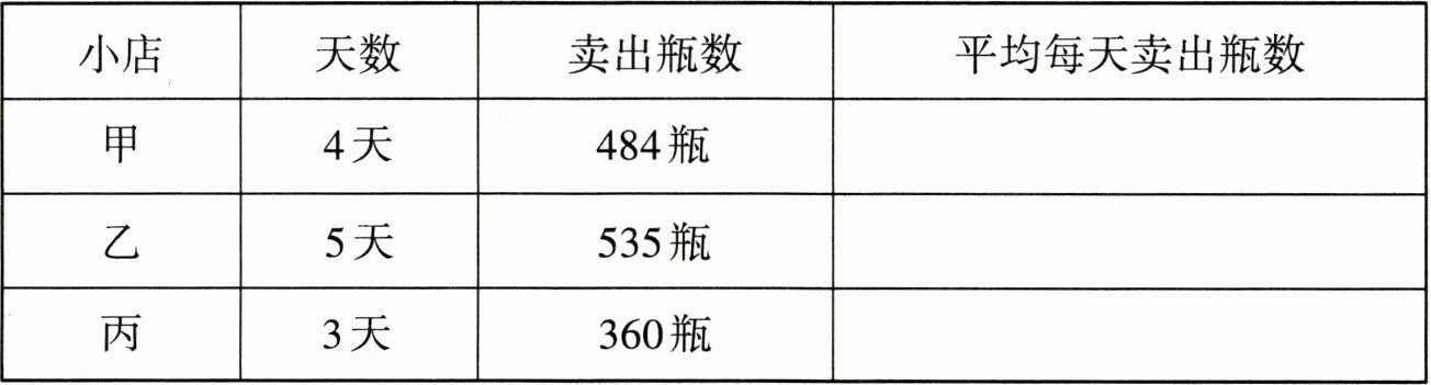 1. 公园门口甲、乙、丙三家小店最近卖出的矿泉水数量如下。算出各小店平均每天卖出多少瓶矿泉水。