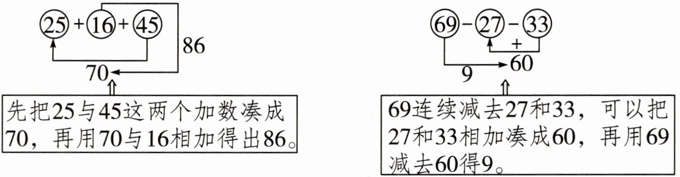 【解析】 这两道题都是100以内的连加、连减计算题,正常情况下要按照从左到右的顺序计算,但通过仔细观察会发现有巧算的方法,如下图: