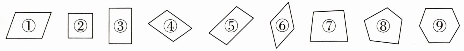 ( )是长方形,( )是正方形,( )是平行四边形,( )是五边形,( )是六边形。