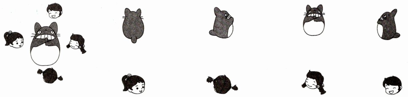 (由于无法直接查看插图进行连线操作,此处需根据实际观察进行连线。正确连线应为:正面女孩头像连正面龙猫图,背面女孩头像连背面龙猫图,右侧女孩头像连右侧龙猫图,上方男孩头像连顶部视角龙猫图。)