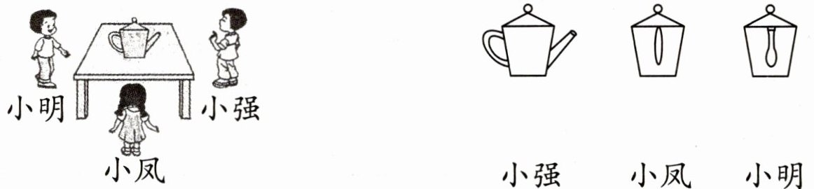答案:图略(将小明与从侧面看到的茶壶形状相连,小强与从正面看到的茶壶形状相连,小凤与从后面看到的茶壶形状相连 )。