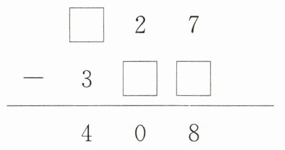 【解析】解答此题,首先要明确减法的笔算方法:相同数位对齐,从个位减起,哪一位不够减,要从前一位退1,在本位上加10再减,则个位上是$17 - □ = 8$;十位上的2要先减去被借走的“1”再减,即十位上是$1 - □ = 0$;百位上是$□ - 3 = 4$。