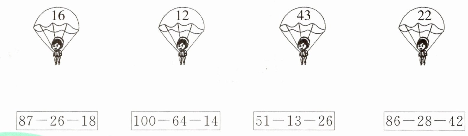 答案为:$87 - 26 - 18 = 43$;$100 - 64 - 14 = 22$;$51 - 13 - 26 = 12$;$86 - 28 - 42 = 16$。