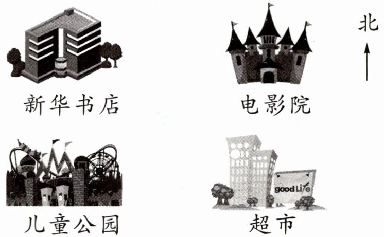 3. 新华书店在电影院的( )面,在超市的( )面。