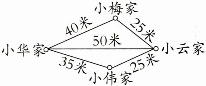 有4条路,先从小梅家到小云家,再由小云家到小伟家,这条路最近。