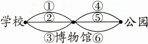 9条路,从学校出发,走第②条路到博物馆,再从博物馆走第⑤条路到公园。