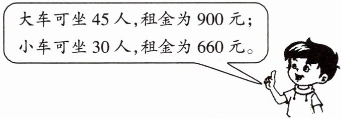 【解析】:本题考查最优方案选择,涉及总人数计算、不同车型人均费用比较及租车方案设计。首先计算总人数:16位老师+134名学生=150人。接着比较大车和小车人均费用,大车人均900÷45=20元,小车人均660÷30=22元,故优先租大车更省钱。然后设计方案:150÷45=3辆……15人,余下15人租小车有空位,调整为租2辆大车(可坐90人),剩余60人租2辆小车(30×2=60人),刚好坐满。计算费用:2×900+2×660=1800+1320=3120元。