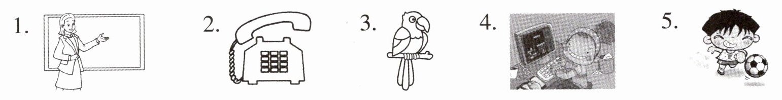 【解析】:本题考查根据图片提示填写单词。1. 图中是一位女士站在黑板前,通常是老师,“老师”是teacher。2. 图中是电话,“接电话”常用answer the phone,所以填phone。3. 图中是一只鸟,“鸟”是bird。4. 图中有人在电脑前,结合“Don't drink”,应是电脑室,“电脑”是computer,所以填computer。5. 图中男孩在踢足球,“踢足球”是play football,句子开头首字母大写,所以填Play football。