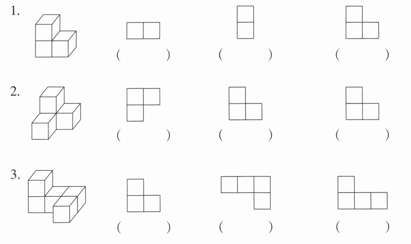 1. 第一个立体图形,从前面看是两层,下层两个正方形,上层左边一个正方形,对应第三个图形,标“△”;从上面看是一排两个正方形,对应第一个图形,标“√”;从左面看是一列两个正方形,对应第二个图形,标“○”。