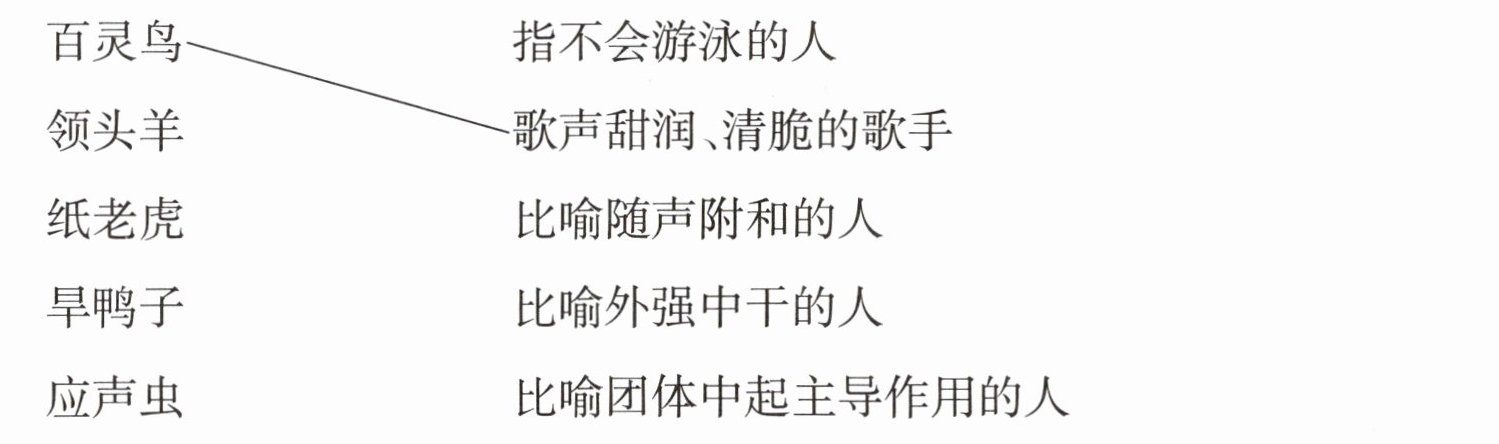 【解析】:本题考查对动物比喻义的理解。需根据每种动物的特点及常见比喻用法进行配对。“百灵鸟”以歌声动听著称,应对应“歌声甜润、清脆的歌手”;“领头羊”在羊群中起带领作用,比喻“团体中起主导作用的人”;“纸老虎”看似强大实则脆弱,是“外强中干的人”;“旱鸭子”常用来形容“不会游泳的人”;“应声虫”指别人说什么就跟着说什么,即“随声附和的人”。