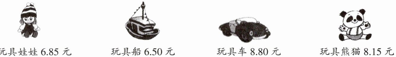 【解析】:题目考查小数加法和乘法的应用。首先需从四种玩具中任选三种,各买10个,计算总价。先算出所选三种玩具单价之和,再乘10。以选玩具娃娃、玩具船、玩具车为例,单价分别为6.85元、6.50元、8.80元,先求和:6.85 + 6.50 + 8.80 = 22.15(元),再算总价:22.15×10 = 221.5(元)。