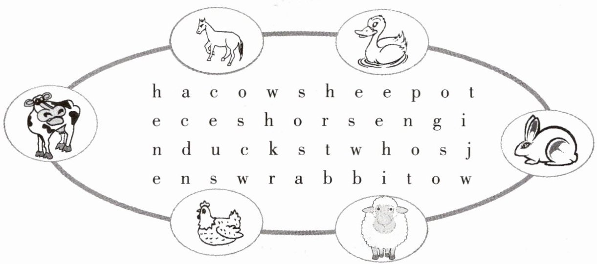 【答案】:圈出的动物对应的单词为:cow(奶牛)、horse(马)、duck(鸭子)、rabbit(兔子)、hen(鸡)、sheep(绵羊)(在图中相应动物图片上圈出)