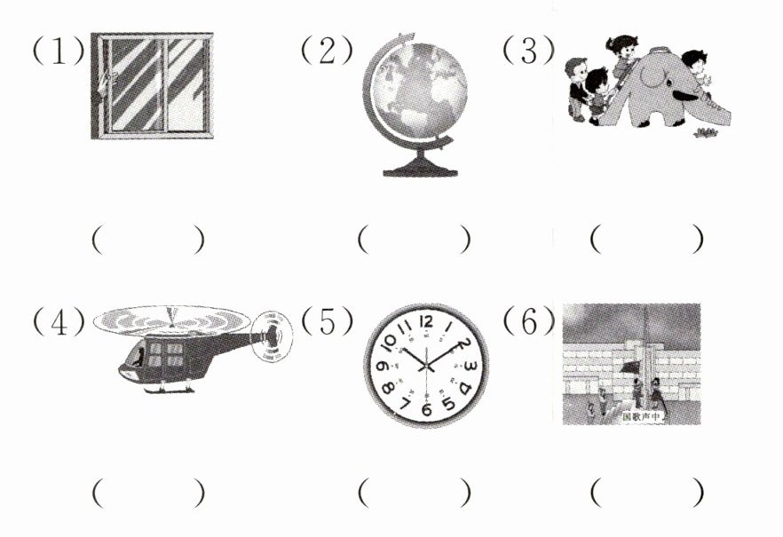 (6)升旗时,国旗是沿着旗杆向上作直线移动,是平移现象,所以在括号里画“$\triangle$”。