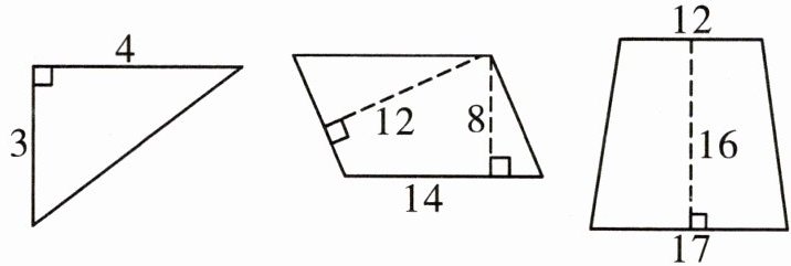 3×4÷2=6(平方厘米) 8×14=112(平方厘米) (12+17)×16÷2=232(平方厘米)