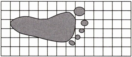 完整的脚印由一个较大的不规则图形和五个小圆点组成。