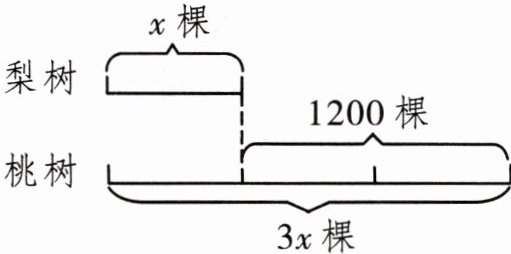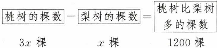 【解析】题目中有两个表示数量之间关系的条件,由“桃树的棵数是梨树的 3 倍”,我们可以设梨树有 $ x $ 棵,桃树有 $ 3x $ 棵。由“种植的桃树比梨树多 1200 棵”,我们可以想到: