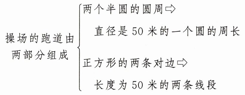 解析:题目考查已知圆的直径求圆的周长,用到圆的周长公式$C = \pi d$($C$表示圆的周长,$d$表示圆的直径,$\pi$通常取$3.14$)。对于由正方形和半圆组成的跑道,其周长由两个半圆的弧长(合起来是一个圆的周长)和正方形的两条边长组成,分别计算各部分长度再求和。