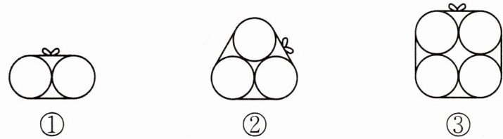 8. 便民超市有三款饮料促销。已知每款饮料瓶的外直径都是 8 厘米,用绳子按下图所示方式各捆 1 圈,打结处还需 10 厘米的绳子。三款饮料包装各需多长的绳子?