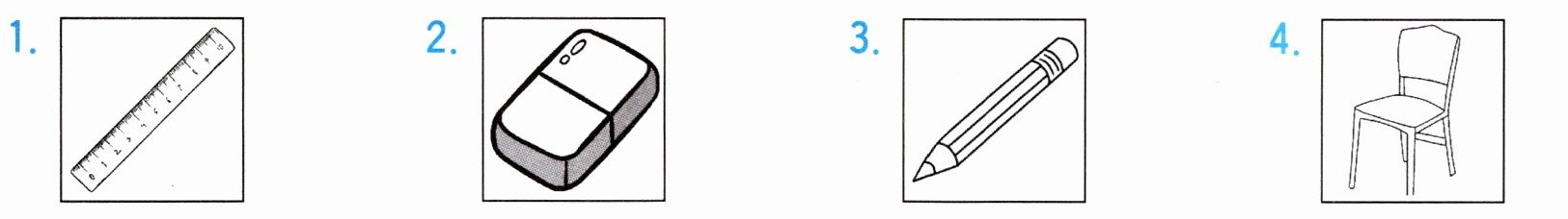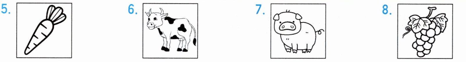 1. ruler 2. rubber 3. pencil 4. chair 5. carrot 6. cow 7. pig 8. grape