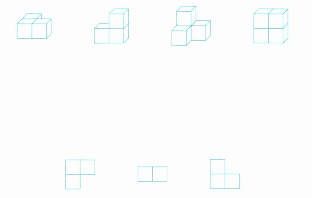 第一个立体图形连第二行中间图形;第二个立体图形连第二行最右图形;第三个立体图形连第二行最左图形;第四个立体图形连第二行中间图形。