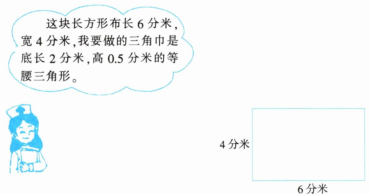 这块长方形布长6分米,宽4分米,我要做的三角巾是底长2分米,高0.5分米的等腰三角形。