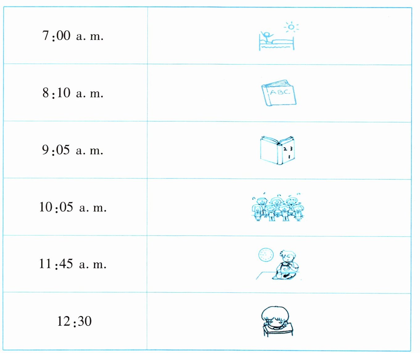 It's s____en o'cl____k. Time to get up. There are th____e classes in the morning. It's 9:05. It is time for m____hs. It's 10:05. It's time for mus____cl____s. We have l____ch at 11:45 in the school. It's 12:30, are you r____dy to take a nap(小睡)?
