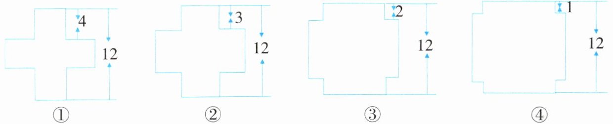 4. 在同样大小的正方形硬纸板的四个角上各剪去一个大小一样的小正方形,便可以做成一个没有盖的纸盒,按下面①②③④四种方法做出的纸盒中,哪一个容积最大?哪一个容积最小?相差多少?(单位:厘米)