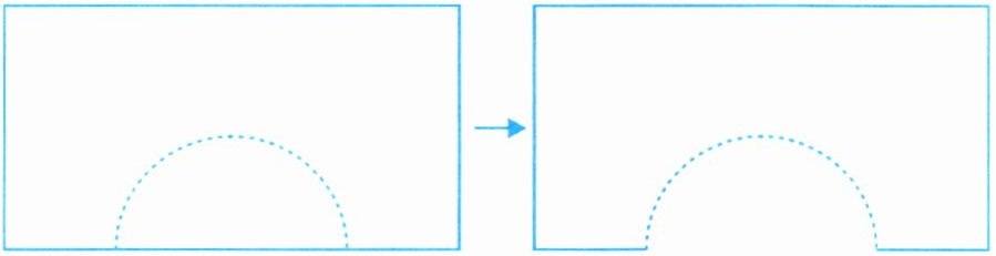 1. 奇奇将一张长方形纸对折后剪下一个半圆,如下图所示,请你想象一下,再将这张纸展开,将会出现什么样的图案? 请你至少画出两种。