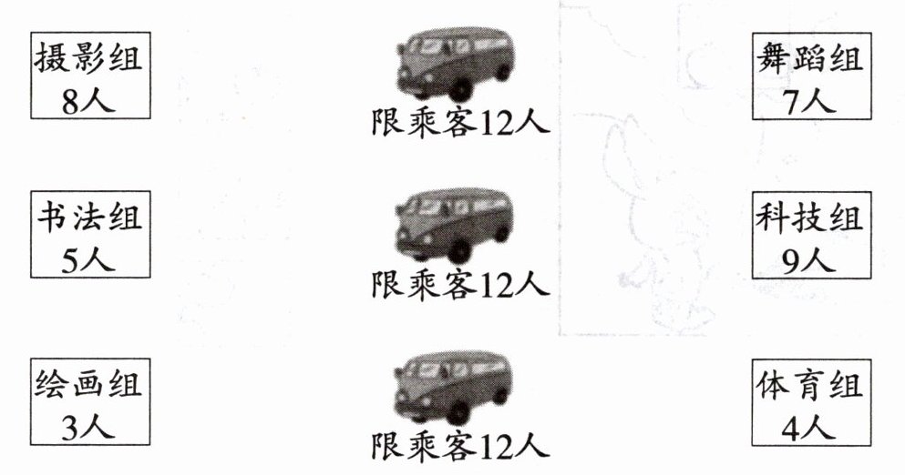 三、学校组织各兴趣小组的同学去参加冬令营,请你想一想,哪两个小组坐同一辆车最合适?连一连。