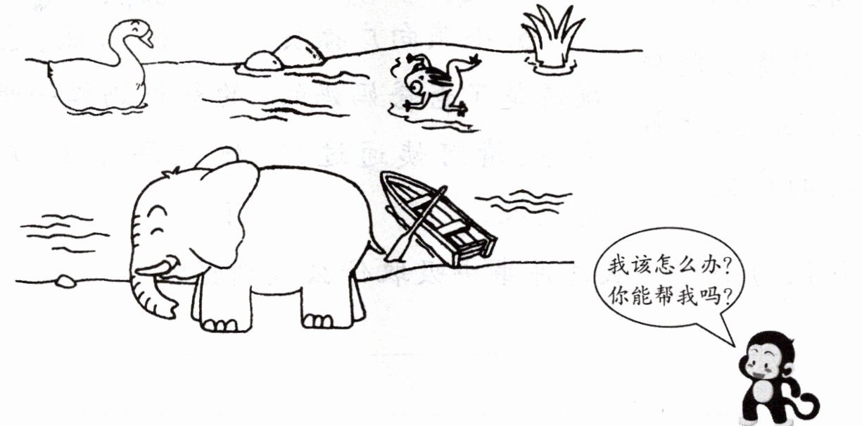 1. 请大象帮忙,让小猴坐在大象背上,大象驮着小猴过河。