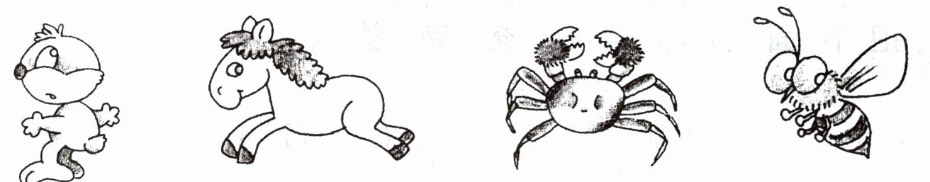 第一幅图补画小熊尾巴上的毛;第二幅图补画小马鬃毛后半部分;第三幅图补画螃蟹眼睛;第四幅图补画蜜蜂触角顶端小球。