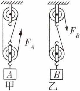 4. 如图所示,用相同的滑轮安装成甲、乙两种装置,分别用拉力$F_{A}$、$F_{B}匀速提升重力为G_{A}$、$G_{B}$的A、B两个物体。物体提升相同高度,不计绳重和摩擦,下列说法正确的是()
