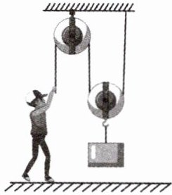 3. 在“老旧小区改造工程”中,工人师傅利用滑轮组吊升重物。如图,工人用200N的拉力通过滑轮组吊起质量为30kg的重物,重物被匀速竖直提升了10m。若不计绳重和摩擦,g取10N/kg,下列说法正确的是()