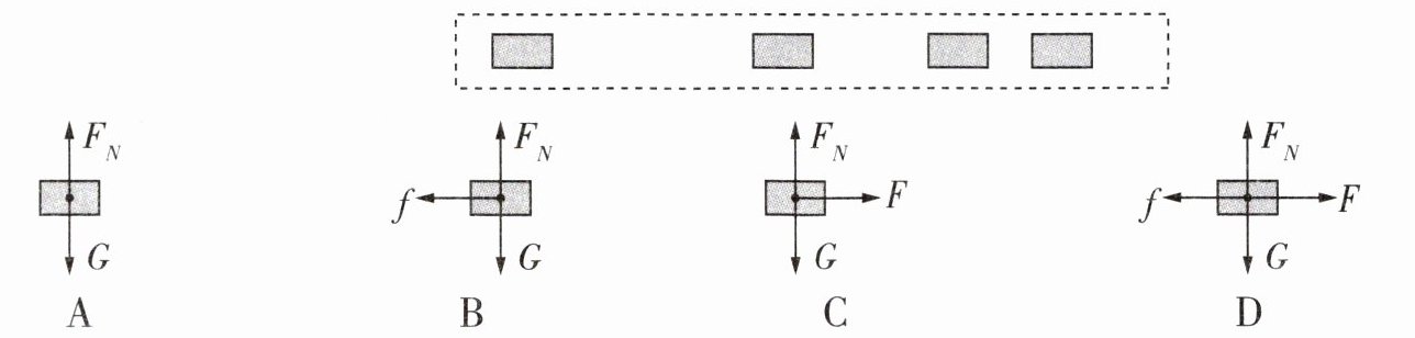 5. 在一个水平桌面上用力F推木块,木块离手后向右做直线运动,部分运动轨迹的频闪照片如图所示。下列能表示照片中的木块所受力的示意图的是()