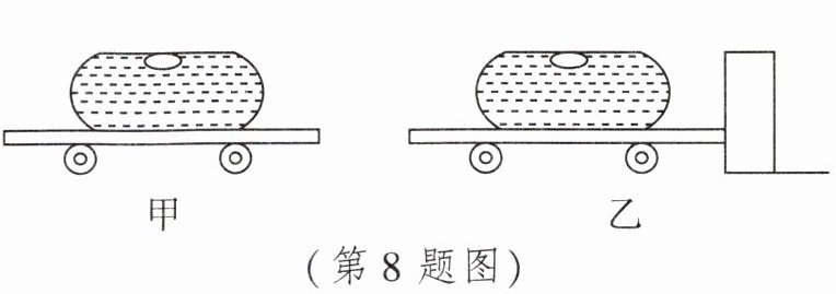 8. 如图甲所示,一个密闭的玻璃管放在平板车上,玻璃管中装有水,管中留有一个小气泡。如图乙所示,当向右做匀速直线运动的平板车碰到障碍物时,气泡向____运动。请你分析产生这种现象的原因:____。