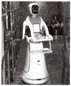 12. 如图所示是送餐机器人在水平地面静止时的情景,送餐机器人总质量为 $ 60 \, \text{kg} $,与地面接触的总面积为 $ 0.01 \, \text{m}^2 $。 $ g $ 取 $ 10 \, \text{N/kg} $,求: