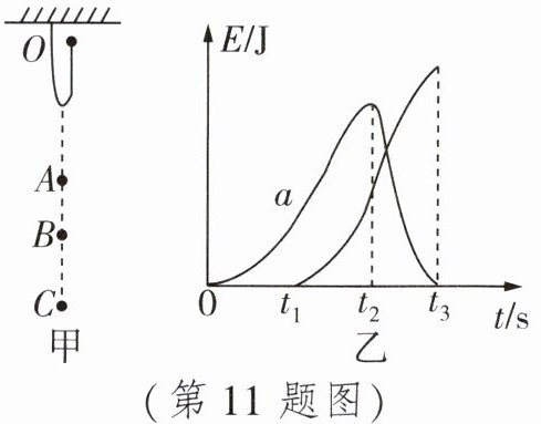 11. 如图甲是蹦极运动过程示意图,小文同学从O点开始下落,OA是弹性绳不受拉力时的长度,在B点时小文所受弹性绳弹力恰好等于自身重力,C点是下落到达的最低点。小文画出了下落过程中自己的动能和弹性绳的弹性势能变化情况,如图乙(不计空气阻力)。
