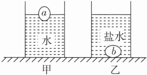 6. 水平桌面上的甲、乙两个相同容器内分别装有水和盐水。小民将一个放了很久的小鸡蛋a放在水中,发现a静止时漂浮,他又找来了一个新鲜的大鸡蛋b放在盐水中,b静止时沉在容器底,如图所示,此时水和盐水的液面相平,下列说法正确的是()