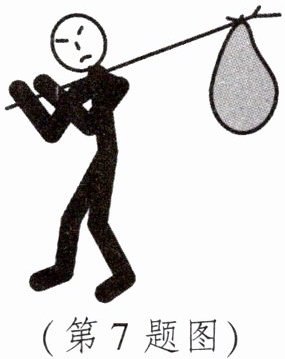 7. 小明用一根木棍将一袋物品挑在肩上,他感到比较吃力,如图所示。此时物品受到的重力______(选填“大于”“小于”或“等于”)手对木棍施加的力,若想减小手对木棍施加的力,他可以将货物______(选填“靠近人”或“远离人”)。