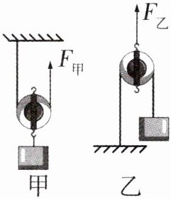 5. 如图所示,小明组装了甲、乙两种滑轮,用来提升完全相同的两个物体(不计绳重、滑轮重和摩擦),拉力$F_{甲}$、$F_{乙}$分别作用在绳端和拉钩上,绳端和拉钩均沿竖直方向匀速上移了相同距离,该过程中物体上升的高度分别为$h_{甲}$、$h_{乙}$,两装置的有用功分别为$W_{甲}$、$W_{乙}$,机械效率分别为$\eta_{甲}$、$\eta_{乙}$,则下列说法中正确的是()
