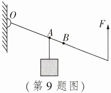 9. 如图所示,用竖直向上的力$F$匀速拉动杠杆,使重为$36N的物体缓慢升高10cm$,拉力$F大小为16N$,拉力作用点移动的距离为$25cm$。拉力所做的功为______$J$,杠杆的机械效率为______。若将物体的悬挂点从$A点向右移动到B$点,将物体提升相同的高度,则杠杆的机械效率将______(选填“变大”“变小”或“不变”)(不考虑摩擦)。