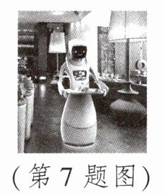 7. 人工智能已逐渐融入我们的生活,如图所示为某款智能机器人,质量为 40 kg,底部轮与地面总接触面积为$ 100 cm^2。$它在某次引领接待工作中,托着餐盘在水平地面上沿直线匀速行走,行走时受到的阻力为重力的 0.06,g 取 10 N/kg。