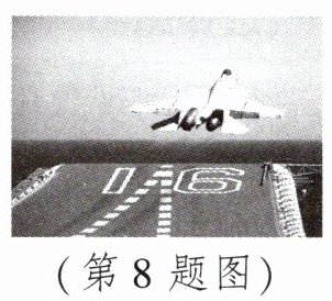8. 如图是我国的“辽宁号”航空母舰出海训练的场景。舰载飞机机翼上凸下平,目的是使战机飞行时机翼下方空气的流速小于机翼上方空气的流速,从而使机翼下方空气的压强____(选填“大于”“等于”或“小于”)机翼上方空气的压强,产生升力;为了提高升力,舰载飞机应该____(选填“顺风”或“逆风”)起飞。