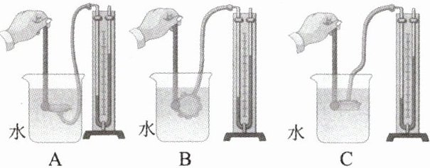 (1)小明首先用手指按了按探头的橡皮膜,发现 U 形管内液柱几乎无变化,其原因是____。然后小明重新调整好器材,继续实验。比较图 A、图 B、图 C,可以得出结论:同种液体,在同一深度,____。将图 A 中的探头逐渐下移,可观察到 U 形管两侧液面的高度差逐渐变大,得出结论:当____一定时,深度越深,____。