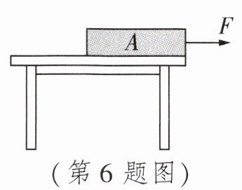 6. 如图所示,一块长为 L 且质量分布均匀的木板 A 放在水平桌面上,木板 A 右端与桌子边缘相齐。在木板 A 右端施加一水平力 F 使木板 A 由图示位置向右缓慢地移动,直至木板 A 伸出桌面的长度为自身长度的 1/3,在木板 A 移动过程中,木板 A 对桌面的压强____,木板受到的桌面的摩擦力____。(均选填“增大”“减小”或“不变”)