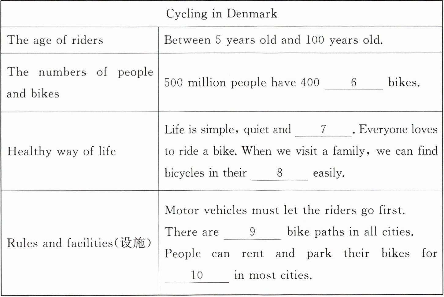 Cycling is the most popular way to travel in Denmark(丹麦). Anyone be-tween the age of 5 and 100 can ride a bicycle. There are only 500 million people there, but they have 400 million bicycles.