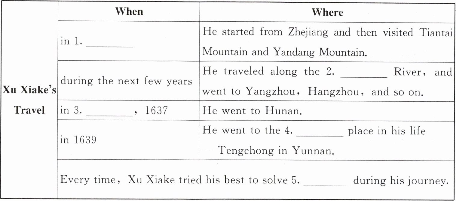 He met many difficulties during his journey, but he didn't give up. Every time he met difficulties, he tried his best to solve(解决) them. He traveled to most places of China. He is really a great traveler.