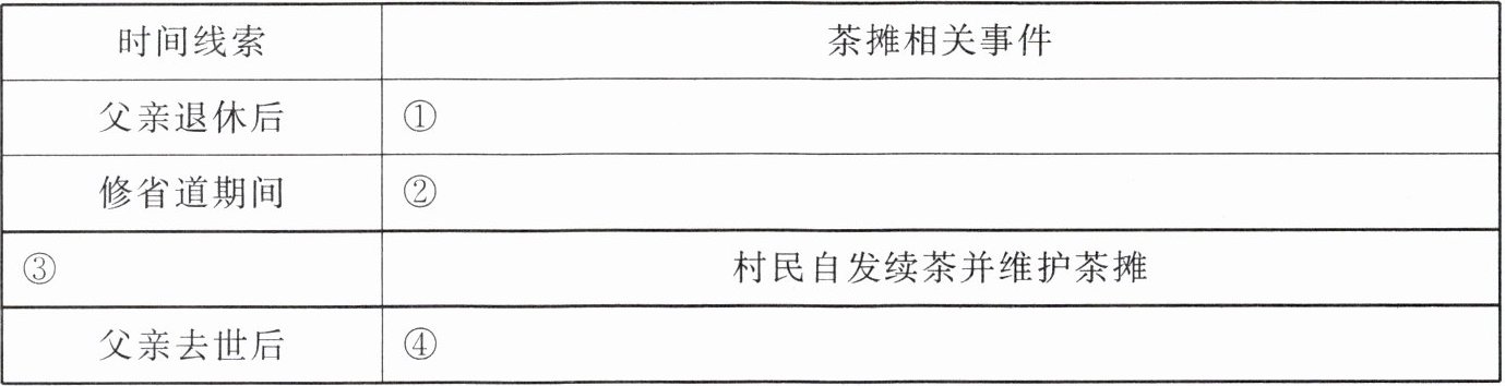 5. 茶摊的变迁贯穿全文,请补全下表。