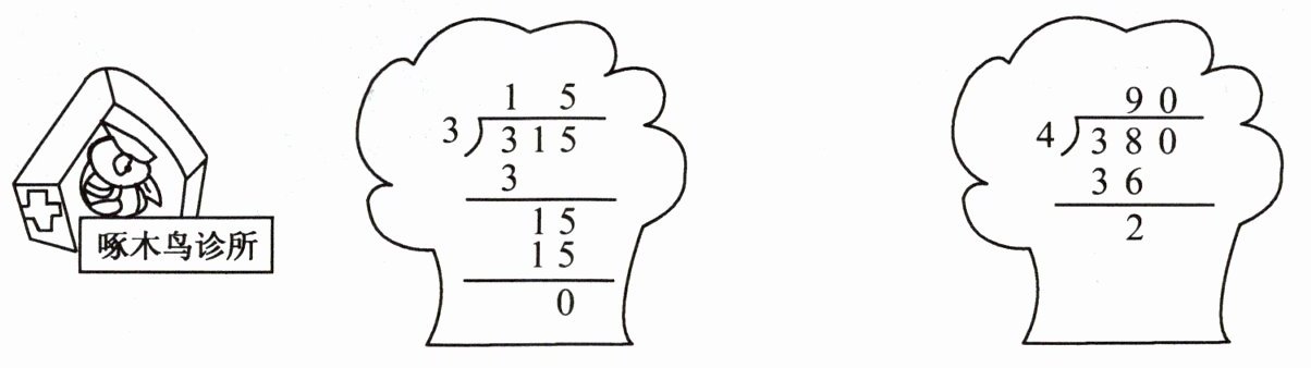 分析:在计算315÷3时,先用百位上的3除以3,商1写在百位上,再用十位上的1除以3,不够商1,应商0占位,然后把十位上的1和个位上的5合起来是15,再除以3商5写在个位上。所以这个竖式不正确。分析:在计算380÷4时,先用38除以4,商9写在十位上,4×9=36,38-36=2,再把个位上的0落下来,20除以4商5写在个位上。所以这个竖式不正确